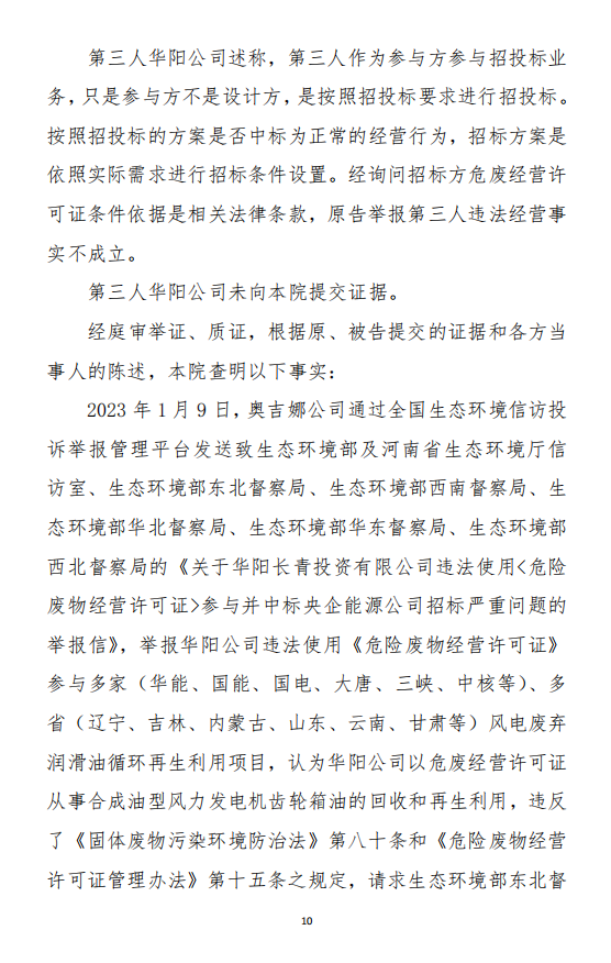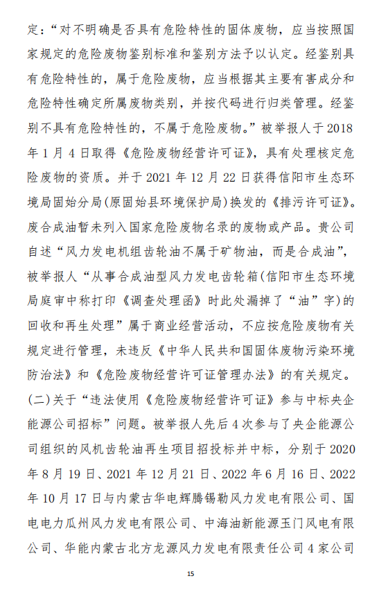 奧吉娜公司在參與各央企風(fēng)電潤滑油招投標(biāo)采購中發(fā)現(xiàn),注冊于河南省信陽市固始縣的華陽長青投資有限公司(以下稱:華陽長青公司),憑借其持有的《危險廢物經(jīng)營許可證》,屢次以“風(fēng)電齒輪油再生利用”的名義中標(biāo)。然而,奧吉娜公司發(fā)現(xiàn),華陽長青公司的《危險廢物經(jīng)營許可證》適用范圍并不包含合成型廢風(fēng)電齒輪油,屬于違規(guī)使用,涉嫌違反《環(huán)境保護(hù)法》。于是,2022年10月18日,奧吉娜公司依法向國家生態(tài)環(huán)境部(以下稱:環(huán)境部)進(jìn)行舉報。按程序,舉報調(diào)查由信陽市生態(tài)環(huán)境局固始分局(以下稱:固始分局)辦理。
