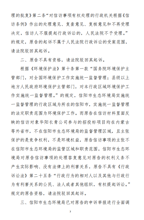 法院的裁定理由是:被告的《信陽市生態(tài)環(huán)境局關(guān)于沈陽奧吉娜化工有限公司舉報華陽長青投資有限公司違法經(jīng)營及固始分局不作為、亂作為的問題調(diào)查處理函》(下稱《調(diào)查處理函》)與原告訴請沒有利害關(guān)系,因此,原告沒有訴訟資格,下附一:《河南省信陽市平橋區(qū)人民法院行政裁定書》(18頁)。
