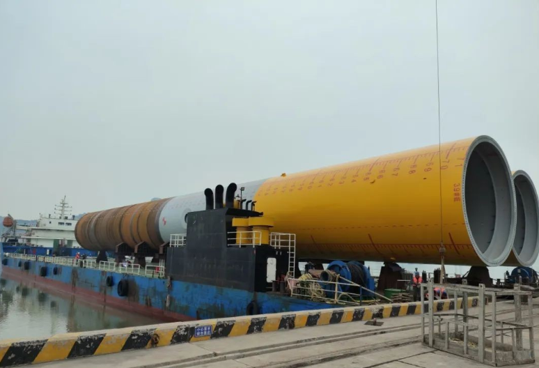 該項(xiàng)目位于山東省東營(yíng)市東部海域,總建設(shè)規(guī)模為700兆瓦。項(xiàng)目設(shè)計(jì)單樁直徑達(dá)7.5米,平均總長(zhǎng)約70米,最大板厚為85毫米,平均每根樁體重量約1000噸,項(xiàng)目總工程量約6500噸。福清公司山東基地承擔(dān)本項(xiàng)目北區(qū)6套單樁的制造和運(yùn)輸任務(wù)。