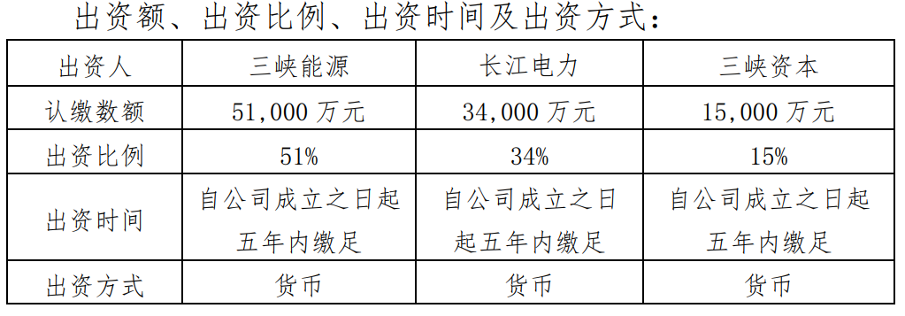 公告披露,為切實(shí)提高三峽能源天津區(qū)域市場(chǎng)競(jìng)爭(zhēng)力,加大天津區(qū)域業(yè)務(wù)統(tǒng)籌力度,公司擬與中國(guó)長(zhǎng)江電力股份有限公司(以下簡(jiǎn)稱長(zhǎng)江電力)、三峽資本控股有限責(zé)任公司(以下簡(jiǎn)稱三峽資本)在天津設(shè)立合資公司三峽集團(tuán)天津能源投資有限公司(最終以企業(yè)登記注冊(cè)的名稱為準(zhǔn)),全方位布局在津業(yè)務(wù),重點(diǎn)聚焦環(huán)渤海海上風(fēng)電基地開(kāi)發(fā),推進(jìn)新能源項(xiàng)目開(kāi)發(fā)建設(shè)。三峽能源、長(zhǎng)江電力與三峽資本以貨幣出資分別認(rèn)繳5.1億元、3.4億元、1.5億元,占合資公司注冊(cè)資本的比例分別為 51%、34%、15%。