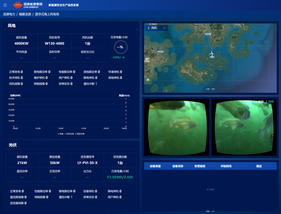 其中,漂浮式平臺側(cè)系統(tǒng)在常規(guī)風電、光伏監(jiān)控基礎上,創(chuàng)新融合了基礎平臺傾仰角度、橫蕩、系泊錨鏈拉力等漂浮式平臺指標監(jiān)測,同時對水質(zhì)溶解氧濃度、葉綠素、餌料投喂等深海養(yǎng)殖情況進行監(jiān)控,首次實現(xiàn)了“漂浮式風電+深海養(yǎng)殖”的多元一體化監(jiān)控;陸上集控側(cè)實時接收平臺側(cè)數(shù)據(jù),對數(shù)據(jù)進行實時接收、轉(zhuǎn)發(fā)、多元一體化集中監(jiān)控和故障報警;本部側(cè)系統(tǒng)嵌入至龍源電力生產(chǎn)監(jiān)控系統(tǒng),可實現(xiàn)多維度實時監(jiān)視和設備故障報警。