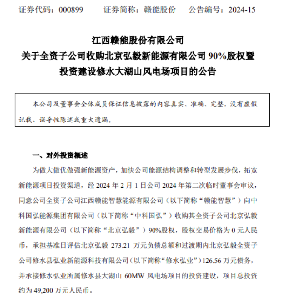 公告顯示,贛能股份全資子公司江西贛能智慧能源有限公司向中科國(guó)弘能源集團(tuán)有限公司收購其全資子公司北京弘毅新能源有限公司90%股權(quán),股權(quán)交易價(jià)格為0元人民幣,承擔(dān)基準(zhǔn)日評(píng)估北京弘毅273.21萬元負(fù)債總額和過渡期內(nèi)北京弘毅全資子公司修水縣弘業(yè)新能源科技有限公司126.56萬元債務(wù),并承接修水弘業(yè)所屬修水縣大湖山60MW風(fēng)電場(chǎng)項(xiàng)目的投資建設(shè),項(xiàng)目總投資約為4.92億元人民幣。
