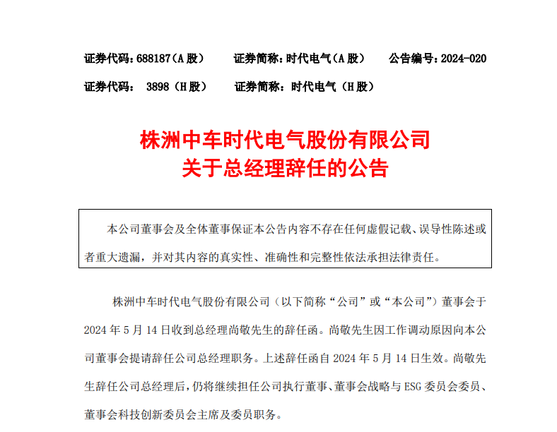 近日,A股上市公司時代電氣發(fā)布公告稱,其董事會已收到公司總經(jīng)理尚敬先生的辭任函。尚敬先生因工作調(diào)動需要,向董事會提請辭去公司總經(jīng)理職務(wù)。公告還顯示,尚敬辭任公司總經(jīng)理后,仍將繼續(xù)擔任公司執(zhí)行董事、董事會戰(zhàn)略與ESG委員會委員等職務(wù)。