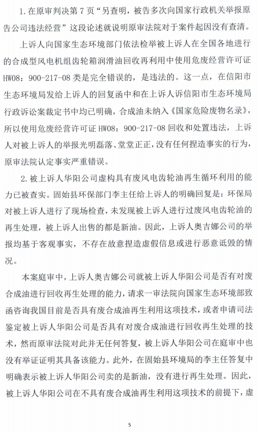 因發(fā)現(xiàn)華陽長青投資有限公司(下稱:長青公司。位于河南省信陽市固始縣)在多家央企風電潤滑油招投標過程中,違法使用只適用于廢礦物油回收處置的《危險廢物經營許可證》HW08:900-217-08,回收處置廢合成型風力發(fā)電機組齒輪油(下稱:廢風電齒輪油)問題,沈陽奧吉娜化工有限公司(下稱:奧吉娜公司)自2022年10月18日起,多次向國家生態(tài)環(huán)境部及直屬部門進行實名舉報。因不接受信陽市生態(tài)環(huán)境局固始分局的多次答復和信陽市生態(tài)環(huán)境局的調查處理結論,奧吉娜公司遂以不作為和亂作為為由,起訴信陽市生態(tài)環(huán)境局(長青公司為第三人),經過固始縣法院的一審、信陽市中級法院的二審、以及河南省高級人民法院的三審,均以奧吉娜公司為“不適格原告”(用白話講,就是沒有起訴資格)為由,裁定駁回起訴、上訴和申訴。