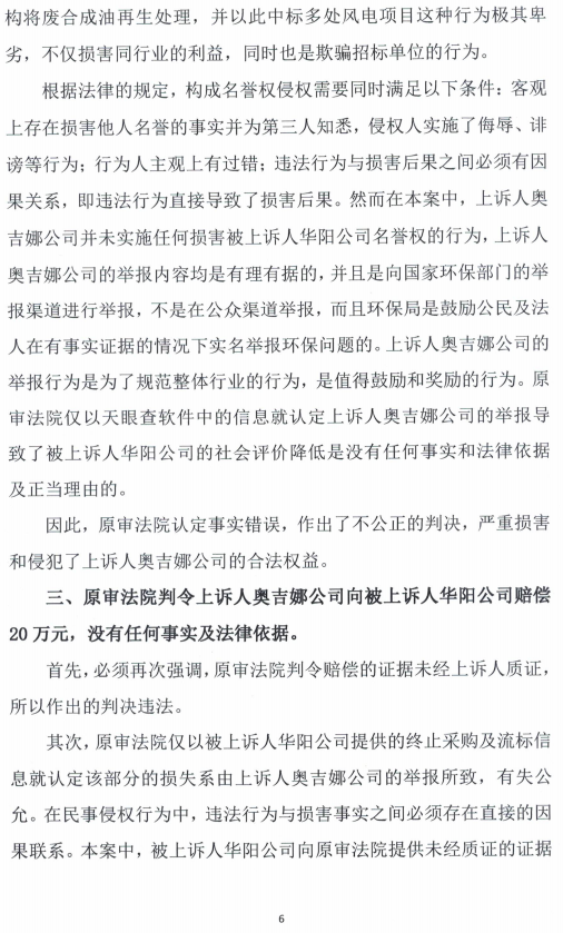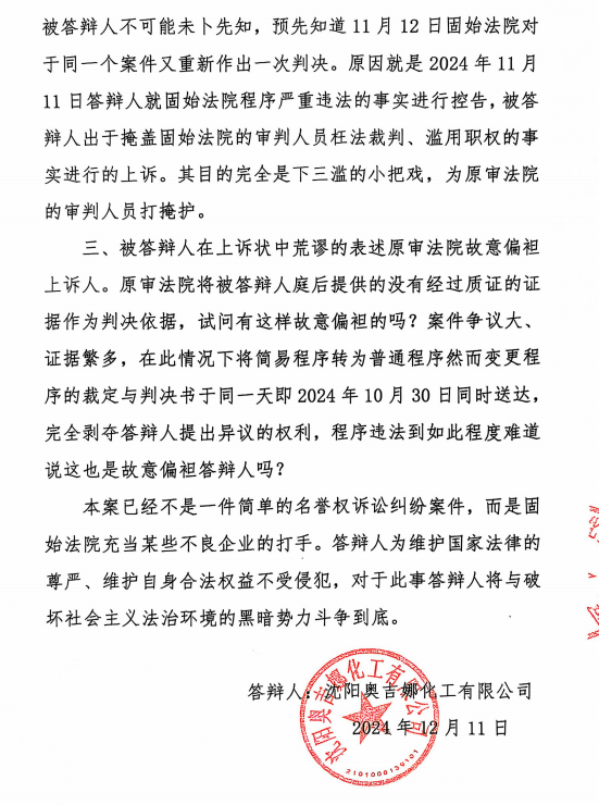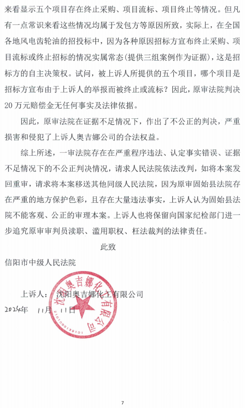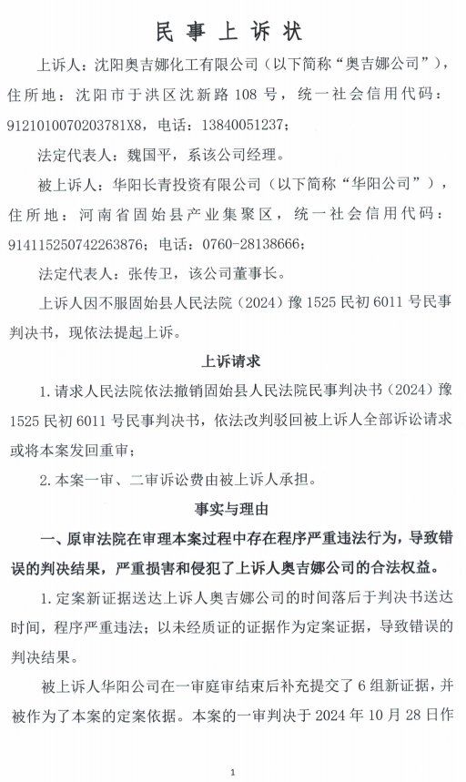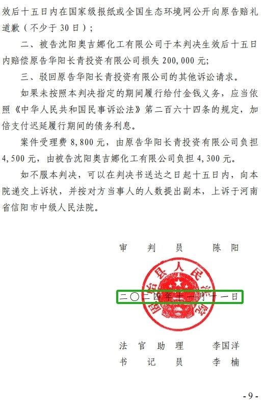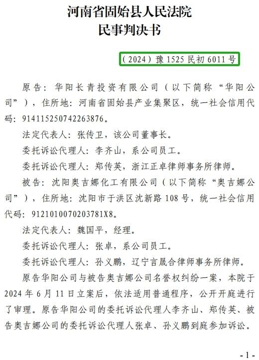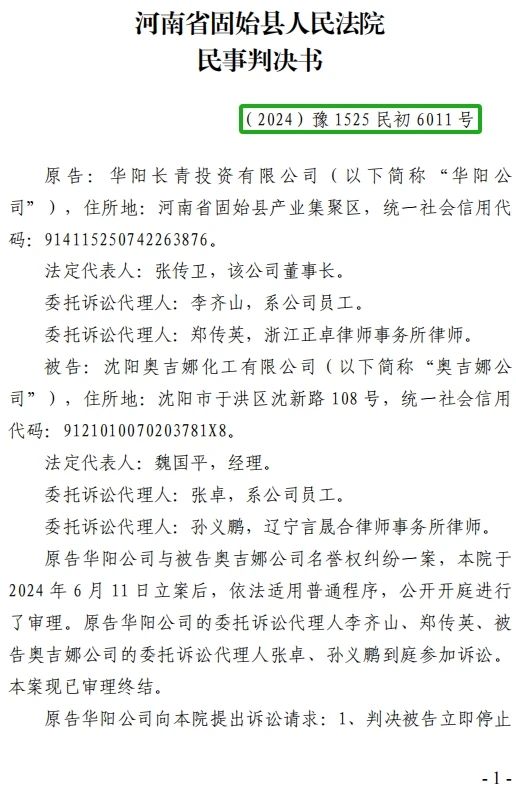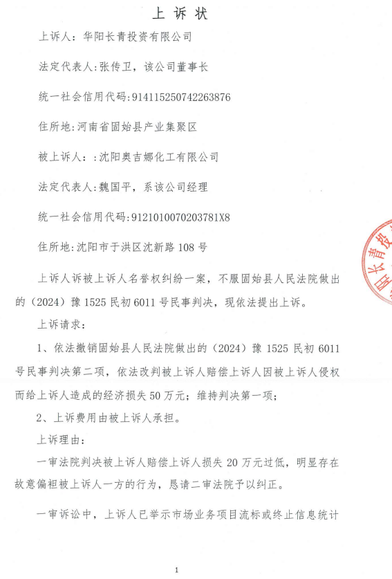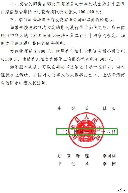5、2024年10月30日,奧吉娜公司收到固始縣法院日期為2024年10月28日的《民事判決書》(2024)豫 1525 民初 6011 號。判決長青公司勝訴如下:“一、被告沈陽奧吉娜化工有限公司立即停止對原告華陽長青投資有限公司的舉報、投訴等名譽侵權行為,并于本判決生效后十五日內在國家級報紙或全國生態(tài)環(huán)境網公開向原告賠禮道歉(不少于 30 日); 二、被告沈陽奧吉娜化工有限公司于本判決生效后十五日內賠償原告華陽長青投資有限公司損失200,000 元; 三、駁回原告華陽長青投資有限公司的其他訴訟請求。 案件受理費8,800元,由原告華陽長青投資有限公司負擔4,500元,由被告沈陽奧吉娜化工有限公司負擔4,300元。”