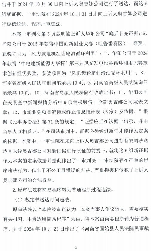 9、2024年12月12日9時30分,華陽長青公司起訴奧吉娜公司侵犯名譽權糾紛案[(2024)豫15民終5218號],二審在信陽市中級人民法院開庭。