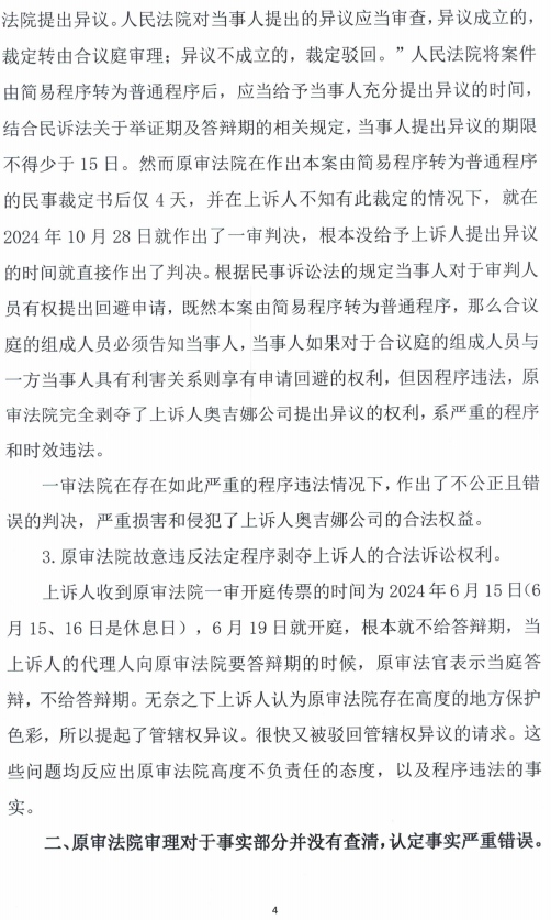 3、奧吉娜公司的答辯意見主要為:“一、原審法院2024年11月12日的判決書違法無效;二、被答辯人的上訴已經超過十五天的上訴期,上訴無效。”(下附奧吉娜公司《答辯意見》)。