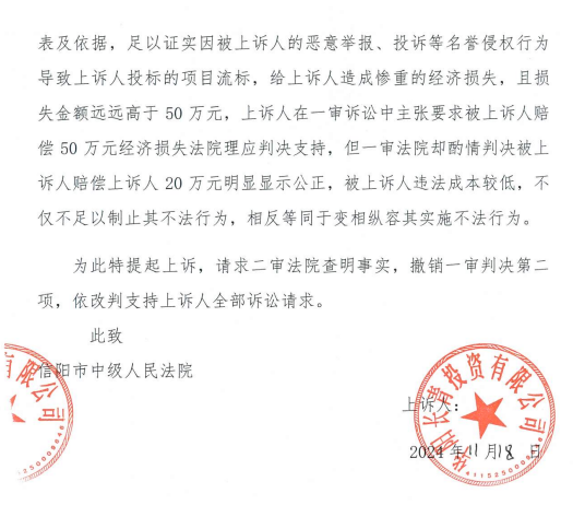 8、2024年11月18日,華陽長青公司提交《上訴狀》(依據(jù)第一個判決書,上訴已超時),請求“1、依法撤銷固始縣人民法院做出的(2024)豫1525 民初 6011號民事判決第二項,依法改判被上訴人賠償上訴人因被上訴人侵權而給上訴人造成的經濟損失50萬元;維持判決第一項;2、上訴費用由被上訴人承擔。”
