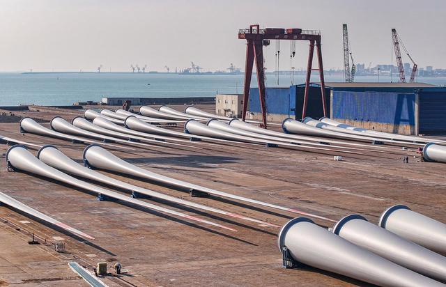 12月23日,威海榮成市石島管理區(qū)海上風(fēng)電產(chǎn)業(yè)基地,近百套超大型風(fēng)電葉片等待吊裝、運(yùn)輸至海上作業(yè)區(qū)進(jìn)行安裝。