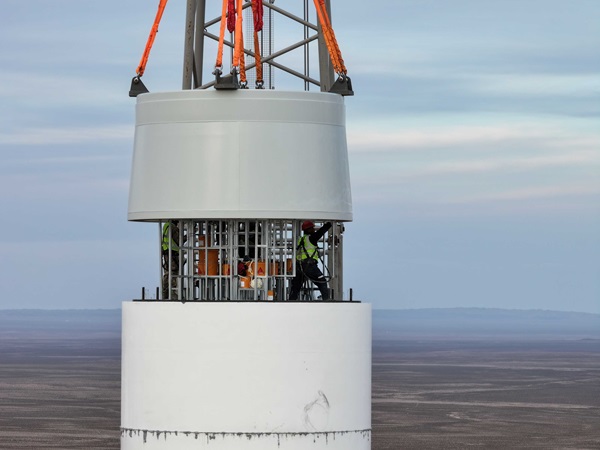 該首臺(tái)套風(fēng)電機(jī)組并網(wǎng),標(biāo)志著全球規(guī)?;逃米畲蠡焖L(fēng)力發(fā)電機(jī)組在內(nèi)蒙古能源集團(tuán)成功發(fā)電運(yùn)行。項(xiàng)目使用的風(fēng)電設(shè)備單機(jī)容量10兆瓦,混塔高134.4米,整機(jī)高度140米,葉片長112米,風(fēng)輪直徑230米,覆蓋及掃風(fēng)面積更大,經(jīng)濟(jì)性和發(fā)電量相對(duì)更高。值得一提的是,此項(xiàng)目風(fēng)機(jī)塔筒由鋼筋混凝土中空、重力式基礎(chǔ)+上部高強(qiáng)混凝土預(yù)制管片疊合而成,是國內(nèi)首次采用內(nèi)張拉、預(yù)應(yīng)力技術(shù)的10兆瓦混塔風(fēng)力發(fā)電項(xiàng)目。塔筒內(nèi)部預(yù)留孔洞固定鋼纜,鋼纜固定后進(jìn)行水泥灌漿填充縫隙,風(fēng)機(jī)運(yùn)行中旋轉(zhuǎn)產(chǎn)生擺動(dòng),使用此技術(shù),在擺動(dòng)時(shí),塔筒內(nèi)部結(jié)構(gòu)均勻受力,整體擺幅程度大大降低,使塔筒整體性更好、耐久性更強(qiáng)、預(yù)應(yīng)力損失小,混塔結(jié)構(gòu)塔筒優(yōu)勢突出。