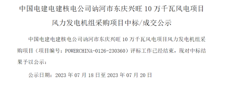 7月18日,中國(guó)電建集中采購(gòu)平臺(tái)發(fā)布《中國(guó)電建電建核電公司訥河市東慶興旺10萬(wàn)千瓦風(fēng)電項(xiàng)目風(fēng)力發(fā)電機(jī)組采購(gòu)項(xiàng)目中標(biāo)/成交公示》的公告。