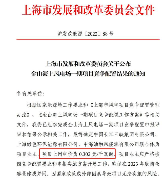 今年4月,上海市發(fā)改委公布了金山海上風(fēng)電場(chǎng)一期項(xiàng)目競(jìng)爭(zhēng)配置結(jié)果,最終確定中國(guó)長(zhǎng)江三峽集團(tuán)有限公司、上海綠色環(huán)保能源有限公司、中海油融風(fēng)能源有限公司聯(lián)合體為項(xiàng)目業(yè)主,項(xiàng)目上網(wǎng)電價(jià)為0.302元/千瓦時(shí)。