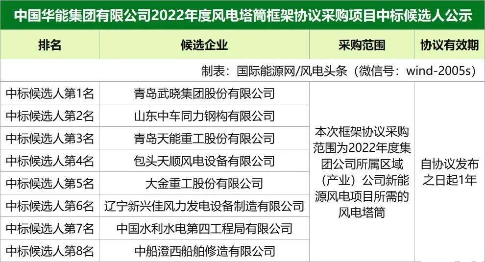 中國華能2022年度風(fēng)電塔筒框架協(xié)議采購項目入圍企業(yè)公示