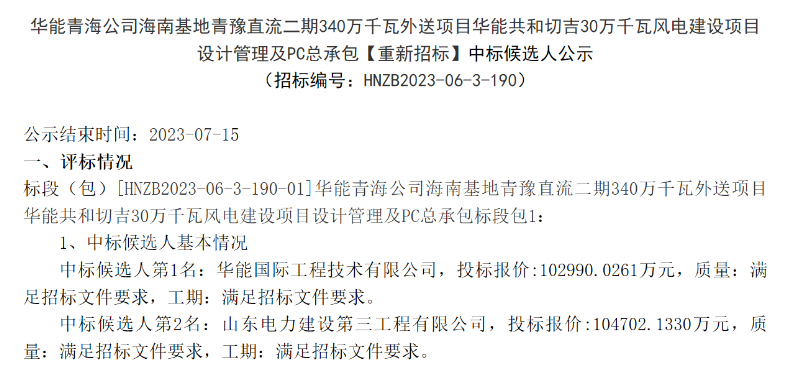 公告顯示,第一中標候選人:華能國際工程技術(shù)有限公司,投標報價:102990.0261萬元。第二中標候選人:山東電力建設(shè)第三工程有限公司,投標報價:104702.1330萬元。第三中標候選人:中國電建集團山東電力建設(shè)第一工程有限公司,投標報價:109934.0179萬元。