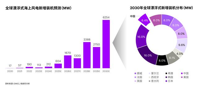 海上風電向深遠海域進發(fā):漂浮式風電為加速進軍深遠海域開辟了新前景。全球已有202.55MW的漂浮式風電項目投運,2023-2025年將有530MW漂浮式風電項目投運4。根據(jù)GWEC的預(yù)測,2026年將實現(xiàn)漂浮式風電的商業(yè)化。預(yù)計到2030年,漂浮式風電裝機規(guī)模將顯著增長,其中中國新增裝機容量將達400MW,占全球新增的6.4%。
