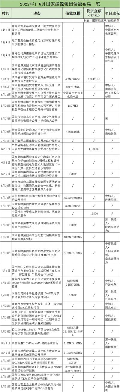 據(jù)不完全統(tǒng)計(jì),2022年1-8月,國(guó)家電投與寧德時(shí)代、中國(guó)電建、中國(guó)天楹等簽訂合作協(xié)議,圍繞儲(chǔ)能材料、風(fēng)光氫儲(chǔ)、重力儲(chǔ)能等方面進(jìn)行合作。儲(chǔ)能項(xiàng)目招標(biāo)26個(gè),涉及飛輪儲(chǔ)能、液流電池、鉛炭電池、抽水蓄能及智慧新能源等方面。
