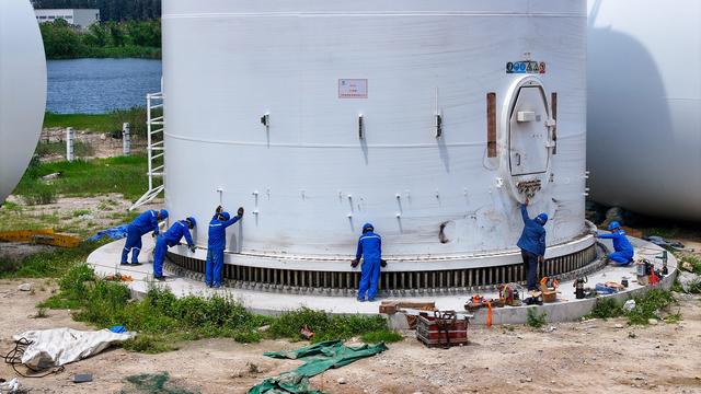 5月15日是全國低碳日。當天,在位于廣東汕頭的全國首個風電臨海試驗基地,一個巨型風電機組塔筒正在緊鑼密鼓地進行吊裝。據(jù)介紹,該風電機組為東方電氣風電股份有限公司(以下簡稱“東方電氣”)研制的機型,容量達18兆瓦,是目前全球已經(jīng)開始安裝的最大功率等級海上風電機組,將于5月底開展并網(wǎng)測試。