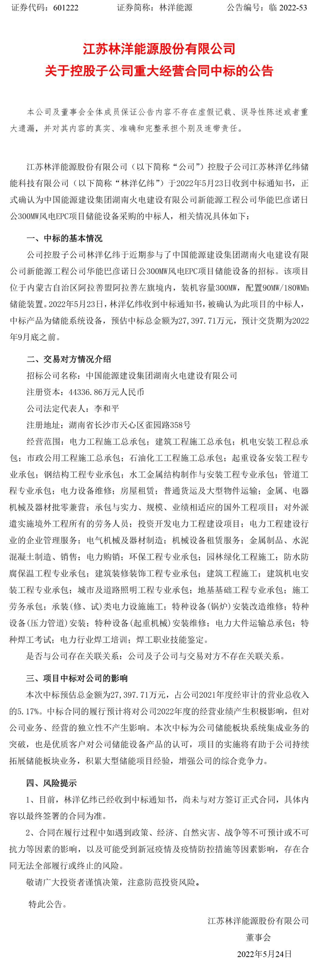 5月23日晚間,林洋能源(601222)(601222.SH)發(fā)布公告,公司控股子公司江蘇林洋億緯儲(chǔ)能科技有限公司正式中標(biāo)中國能源建設(shè)集團(tuán)湖南火電建設(shè)有限公司新能源工程公司華能巴彥諾日公300MW風(fēng)電EPC項(xiàng)目?jī)?chǔ)能設(shè)備采購,預(yù)估中標(biāo)總金額為2.74億元。