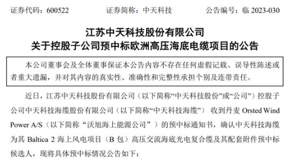中天科技稱,本次預(yù)中標(biāo)項目的金額占其公司2022年度經(jīng)審計營業(yè)收入的3.00%,對公司未來經(jīng)營業(yè)績將有積極影響。中天科技海纜將以此為新的契機,進(jìn)一步深耕歐洲海風(fēng)市場,為全球海上風(fēng)電建設(shè)、海洋能源勘探提供穩(wěn)定可靠的技術(shù)支撐及創(chuàng)新引領(lǐng)。
