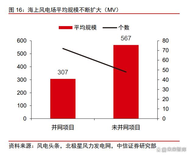 大型化和風(fēng)電場規(guī)?;铀?,推動風(fēng)機(jī)降本。大型化是海風(fēng)降低單位 GW 成本的主要 途徑,大型風(fēng)機(jī)單位功率對應(yīng)的耗材更少,同時由于大型化后所需機(jī)組數(shù)量有效減少,可 顯著降低安裝及運維成本。根據(jù)明陽智能官網(wǎng)披露,以明陽智能 MySE12MW 半直驅(qū)海上 機(jī)組為例,在 1000MW 項目中,8MW 機(jī)組需要 125 臺,12MW 機(jī)組僅需 84 臺,節(jié)約用 海面積 30%以上,全場基礎(chǔ)成本降低 24%,塔筒成本降低 27%,經(jīng)濟(jì)性凸顯。