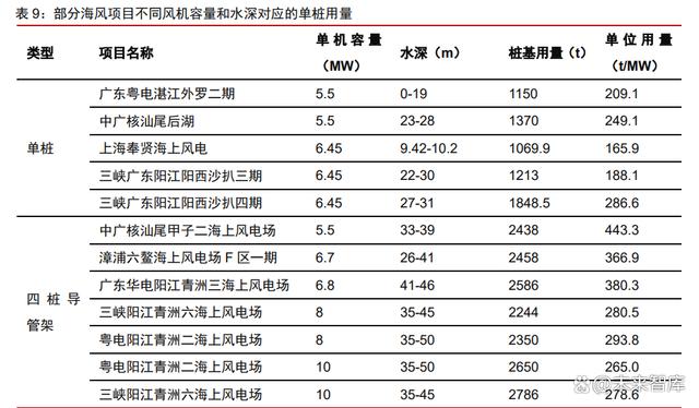 風(fēng)機(jī)大型化對塔筒單 MW 需求量攤薄有限。大型化降本主要環(huán)節(jié)是對零部件單 GW 價值量的攤薄,風(fēng)機(jī)重量增加后,由于塔筒高度有所升高,筒壁厚度、壁面強(qiáng)度的結(jié)構(gòu)要 求提升,塔筒單 GW 需求量相對穩(wěn)定,有望保持與風(fēng)機(jī)裝機(jī)量相近的增速。據(jù)海力風(fēng)電招 股說明書,在裝機(jī)項目的單機(jī)容量提升趨勢下(2018 年平均 2.44MW升至2021H1 的平 均 4.36MW,提升 78.7%),單 MW 塔筒用量下降幅度有限,從 70t/MW 降至 68t/MW, 僅下滑 14%,單位用量降幅遠(yuǎn)小于風(fēng)機(jī)單位容量的增長。 深遠(yuǎn)海趨勢平衡大型化攤薄的樁基用量,導(dǎo)管架、漂浮式需求有望提升。風(fēng)機(jī)大型化 背景下,同樣水深條件下的單樁 GW 用量受攤薄下降,但樁基用量會隨水深上升。通常來 說,水深小于 20m 的近海區(qū)域時使用 1200t 以下的單樁,20-30m 海域使用 1200-1900t 的單樁,30m 以上的海域則以 2200-2800t 的導(dǎo)管架基礎(chǔ)為主,此外漂浮式基礎(chǔ)重量均超 3000t。隨著風(fēng)機(jī)容量增大,深?;瘞順痘膯挝挥昧可仙欢ǔ潭壬蠌浹a(bǔ)分?jǐn)傆昧繙p 少,相較于單機(jī)容量 5.5MW、水深 23-28m 的中廣核汕尾后湖海風(fēng)項目的樁基單位用量 249t/MW,單機(jī)容量 6.45MW、水深 9-10m 的上海奉賢海風(fēng)項目樁基單位用量僅為 166t/MW??紤]中長期海上風(fēng)電向深遠(yuǎn)海發(fā)展,導(dǎo)管架和漂浮式基礎(chǔ)滲透率有望提升。