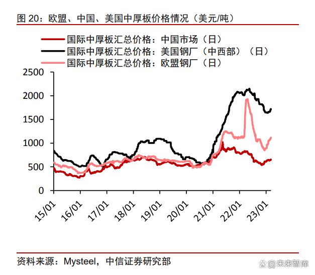 海外塔筒樁基生產(chǎn)成本高昂,國內(nèi)成本優(yōu)勢強(qiáng)化。對比歐洲單樁龍頭 Sif 平均出貨價(jià) 格近 2500 歐元/噸(約合人民幣 1.9 萬元/噸),且供需緊縮呈價(jià)漲趨勢,我國單樁價(jià)格約 0.8 萬元/噸。在原材料成本方面,以天風(fēng)順能披露的數(shù)據(jù)為例,鋼材、法蘭等原材料成本 占塔筒總成本的 82%,其中鋼板(中厚板)成本占 57%,對比俄烏戰(zhàn)爭爆發(fā)以來的歐洲 鋼材價(jià)格暴漲,中厚板國內(nèi)外價(jià)差拉大。2023 年 3 月歐盟鋼廠中厚板均價(jià) 1100 美元/噸, 美國鋼廠均價(jià) 1710 美元/噸,而中國市場均價(jià) 649 美元/噸。在人工成本方面,根據(jù)歐盟披 露,歐盟本地塔筒企業(yè)的人均人工成本為 4.8 萬歐元/年,明顯高于國內(nèi)主要塔筒企業(yè)的人 均薪酬。我們預(yù)計(jì)塔筒環(huán)節(jié)有望進(jìn)一步強(qiáng)化國產(chǎn)出海的成本優(yōu)勢,樁基環(huán)節(jié)暫無反傾銷限 制,有望實(shí)現(xiàn)產(chǎn)品出口的突破。
