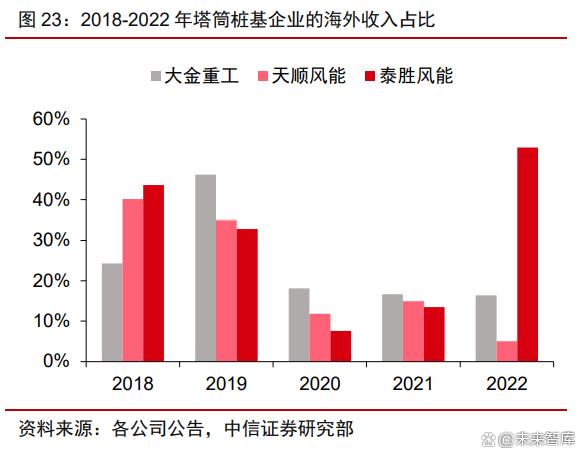 頭部廠商重視外銷業(yè)務(wù),有望持續(xù)拓展全球市場份額。國內(nèi)頭部企業(yè)均積極延伸海外 業(yè)務(wù),在建產(chǎn)能規(guī)劃于2023-2024 年陸續(xù)投產(chǎn)。代表性廠商在 2018-2019 年海外收入占 比平均超 30%,2020 年和 2021 年受益陸上和海上風(fēng)電搶裝潮,產(chǎn)品內(nèi)銷需求量和毛利 率有所上漲,廠商業(yè)務(wù)重點(diǎn)著眼于國內(nèi)市場,外銷業(yè)務(wù)占比下降至 15%左右。隨著疫情形 勢平穩(wěn)和國內(nèi)搶裝潮結(jié)束,2022 年頭部廠商繼續(xù)海外布局,以泰勝風(fēng)能為代表的塔筒樁 基企業(yè)海外收入占比創(chuàng)歷史新高。我們預(yù)計(jì)隨著海工頭部廠商出海節(jié)奏的加快,頭部企業(yè) 將在經(jīng)濟(jì)性、飽滿產(chǎn)能、穩(wěn)定交付能力、海外歷史業(yè)績的優(yōu)勢基礎(chǔ)上繼續(xù)拓展海外海上塔 筒和樁基市場,搶占全球市場份額。