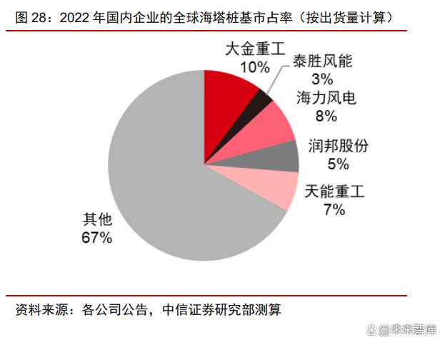 海風(fēng)基礎(chǔ)高壁壘高門檻,國內(nèi)行業(yè)格局集中。與陸上塔筒的分散格局不同,由于海上 塔筒樁基所需碼頭資源的緊缺和產(chǎn)能布局的重要性,國內(nèi)目前從事海風(fēng)塔筒和樁基生產(chǎn)的 企業(yè)較少,大金重工、海力風(fēng)電、天順風(fēng)能、潤邦股份和泰勝風(fēng)能為主的少數(shù)領(lǐng)先企業(yè)貢 獻(xiàn)國內(nèi)的主要行業(yè)產(chǎn)能。我們根據(jù)出貨量測算,2022 年主導(dǎo)企業(yè)海力風(fēng)電、大金重工、 泰勝風(fēng)能、天能重工、潤邦股份的海上塔筒和樁基的全球市占率合計(jì)約 30%。