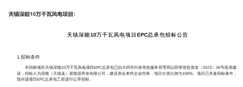 招標(biāo)范圍:天鎮(zhèn)深能10萬千瓦風(fēng)電項目的勘察、設(shè)計、采購、施工一體化EPC總承包“交鑰匙”工程,包括但不限于: