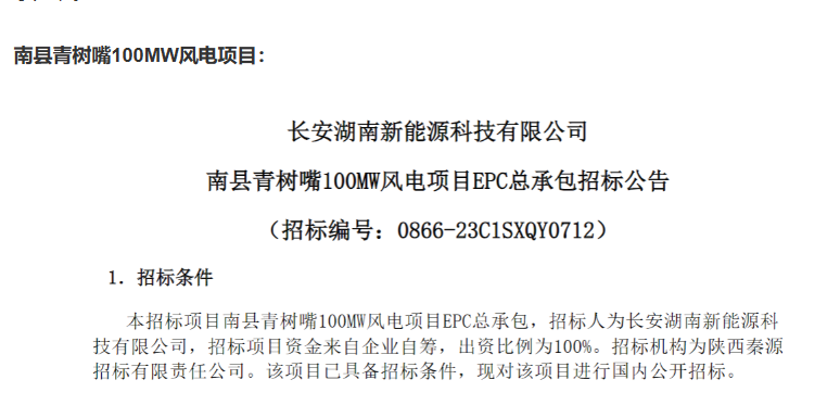 公告顯示,南縣青樹嘴風(fēng)電場項目總?cè)萘?00MW,年等效滿負(fù)荷利用小時不低于1815小時。安裝16臺單機容量不低于6.25MW的風(fēng)力發(fā)電機組,輪轂高度不低于160m,采用混塔方式,葉輪直徑不低于191m。