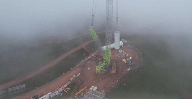 項目團隊為了確保萬無一失,在吊裝前反復推演。作為最后一臺風機吊裝的主吊設備,最終通過中聯(lián)重科履帶式起重機的起升臂配合風機葉片專用夾持工裝,將長97.3m的葉片吊起并與相當于33層樓高的輪轂完成精準對接。