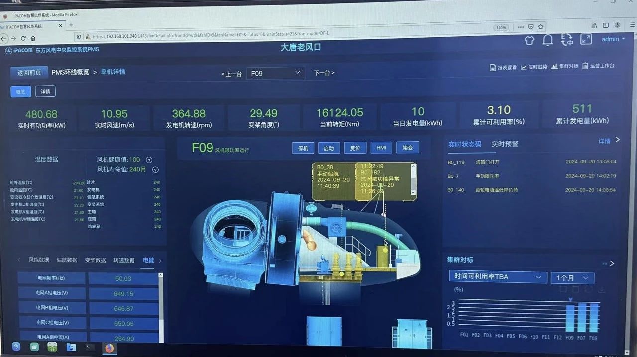 2024年9月20日14時18分,隨著現(xiàn)場總指揮一聲“啟動”指令下達,大唐塔城老風(fēng)口項目9號風(fēng)機徐徐轉(zhuǎn)動中控室并網(wǎng)。