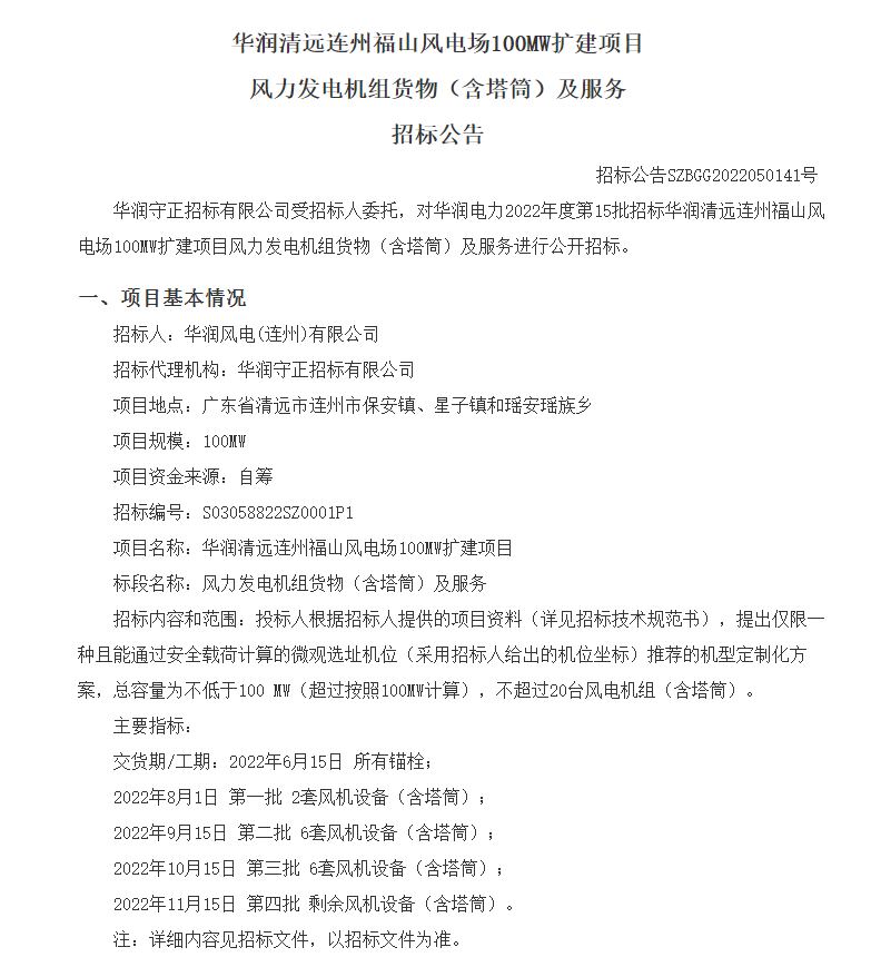 華潤清遠(yuǎn)連州福山風(fēng)電場100MW擴(kuò)建項(xiàng)目風(fēng)力發(fā)電機(jī)組貨物(含塔筒)招標(biāo)