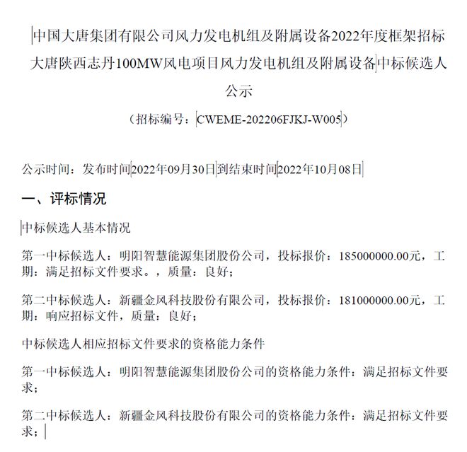 9月30日,中國大唐集團有限公司風(fēng)力發(fā)電機組及附屬設(shè)備2022年度框架招標(biāo)大唐陜西志丹100MW風(fēng)電項目風(fēng)力發(fā)電機組及附屬設(shè)備中標(biāo)候選人公示,明陽智能預(yù)中標(biāo),投標(biāo)報價18500萬元。
