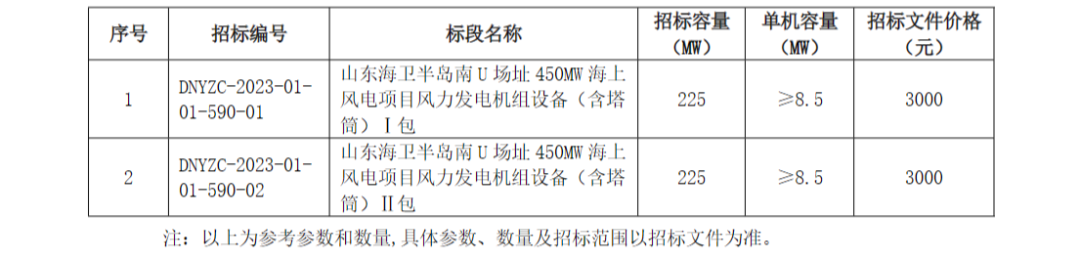 此次招標(biāo)共劃分為2個(gè)標(biāo)段,招標(biāo)包I、包II標(biāo)段供貨范圍為總裝機(jī)規(guī)模 450MW、單臺(tái)機(jī)組容量 8.5MW及以上的海上風(fēng)力發(fā)電機(jī)組設(shè)備(整個(gè)項(xiàng)目可上浮小于 1臺(tái)單機(jī)容量)及塔筒和配套服務(wù),具體供貨及服務(wù)范圍包括但不限于: