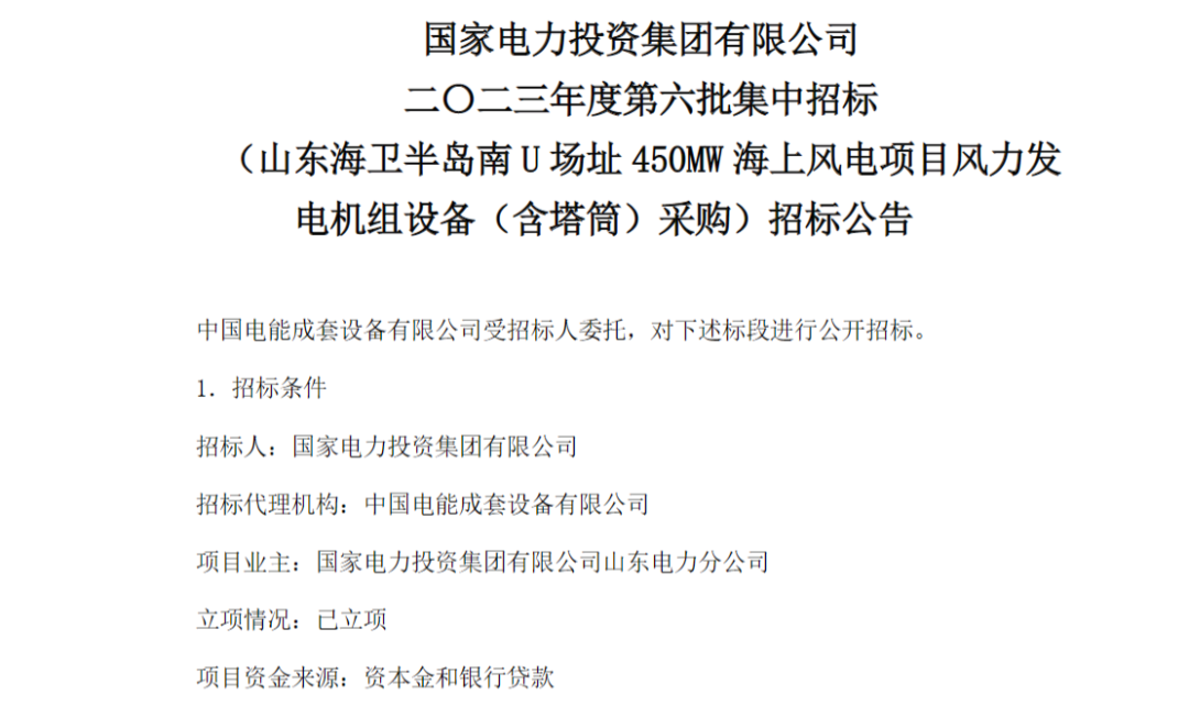 近日,國家電投發(fā)布《國家電力投資集團(tuán)有限公司二〇二三年度第六批集中招標(biāo)(山東海衛(wèi)半島南 U場址 450MW海上風(fēng)電項(xiàng)目風(fēng)力發(fā)電機(jī)組設(shè)備(含塔筒)采購)招標(biāo)公告》。