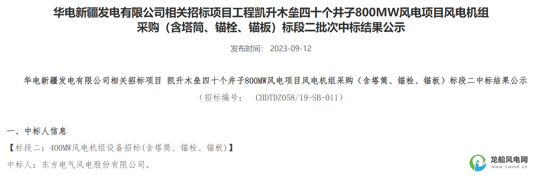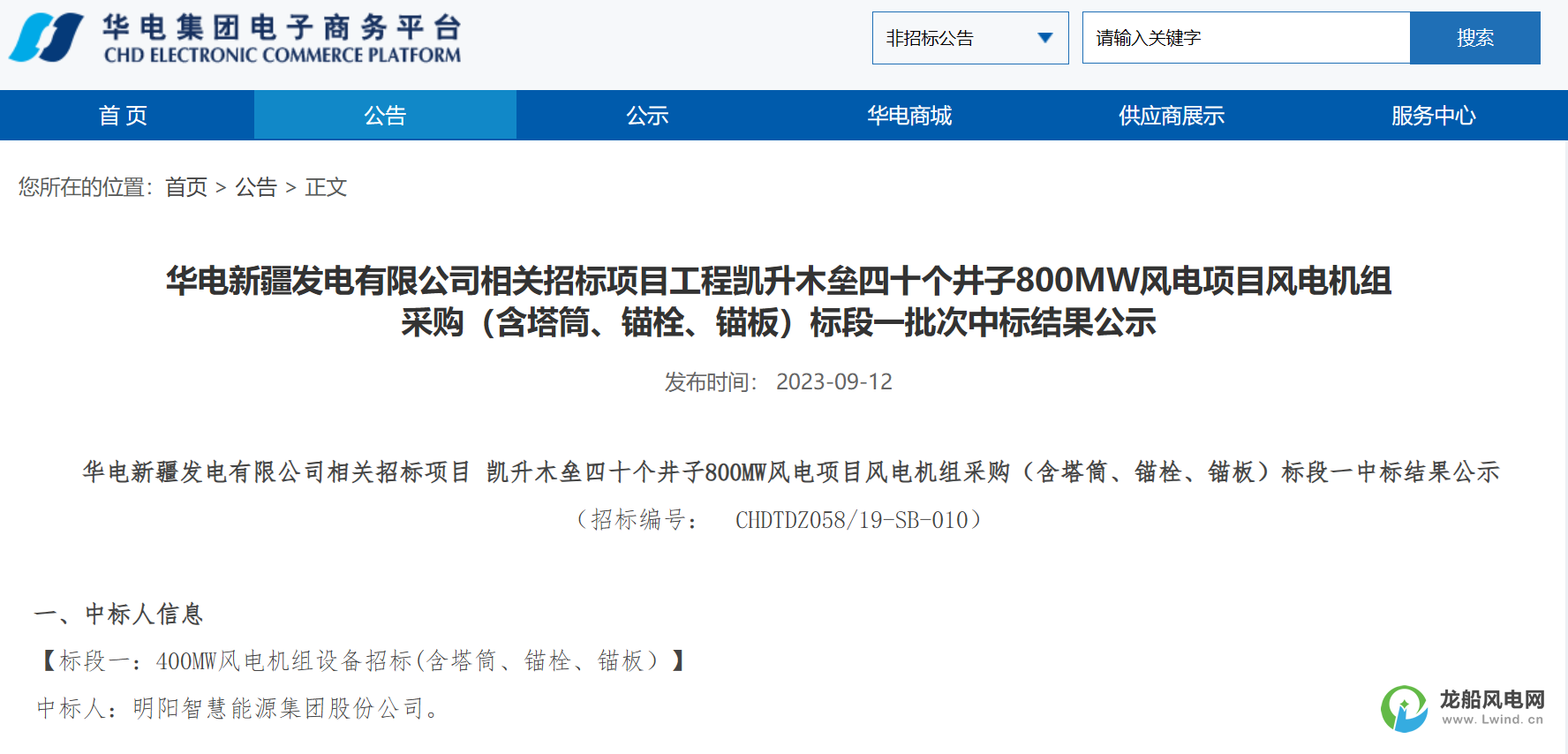 9月12日,華電集團電子商務(wù)平臺發(fā)布華電新疆發(fā)電有限公司相關(guān)招標(biāo)項目凱升木壘四十個井子800MW風(fēng)電項目風(fēng)電機組采購(含塔筒、錨栓、錨板)標(biāo)段一、標(biāo)段二中標(biāo)結(jié)果公示的公告。