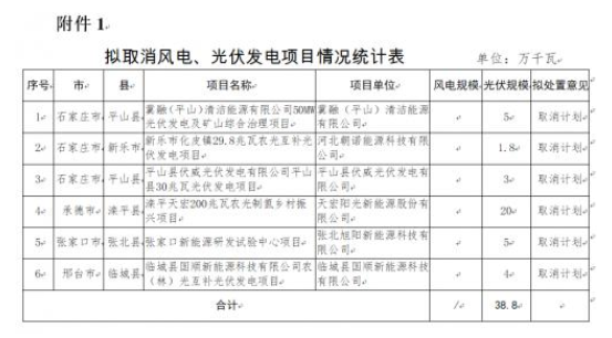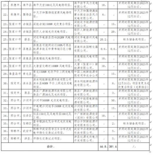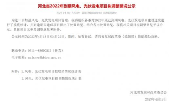 4月18日,河北省發(fā)改委對(duì)2022年到期風(fēng)電、光伏發(fā)電項(xiàng)目擬調(diào)整情況進(jìn)行公示。公示表示,為進(jìn)一步加強(qiáng)風(fēng)電、光伏發(fā)電項(xiàng)目管理,對(duì)2022年底已到期風(fēng)電、光伏發(fā)電項(xiàng)目建設(shè)進(jìn)度進(jìn)行了摸底統(tǒng)計(jì),并對(duì)逾期未建成項(xiàng)目提出了處置意見。其中,擬取消8個(gè)風(fēng)電、光伏發(fā)電項(xiàng)目,規(guī)模合計(jì)388MW;風(fēng)電、光伏發(fā)電項(xiàng)目擬調(diào)整37個(gè),規(guī)模合計(jì)4484MW,其中,光伏項(xiàng)目3816MW。