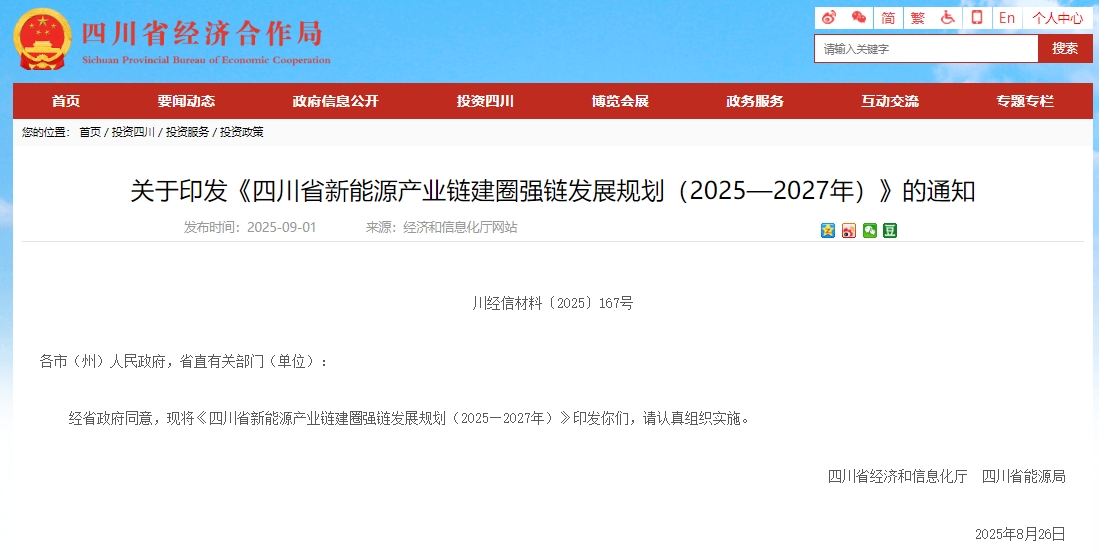 近日,四川省經濟和信息化廳聯合省能源局印發(fā)《四川省新能源產業(yè)鏈建圈強鏈發(fā)展規(guī)劃(2025—2027年)》(以下簡稱《規(guī)劃》)?!兑?guī)劃》聚焦光伏、風電、氫能、新型儲能等重點領域的產業(yè)發(fā)展綜合實力提升,提出到2027年,四川省新能源產業(yè)鏈營業(yè)收入超過5000億元,力爭達到6000億元的發(fā)展目標。