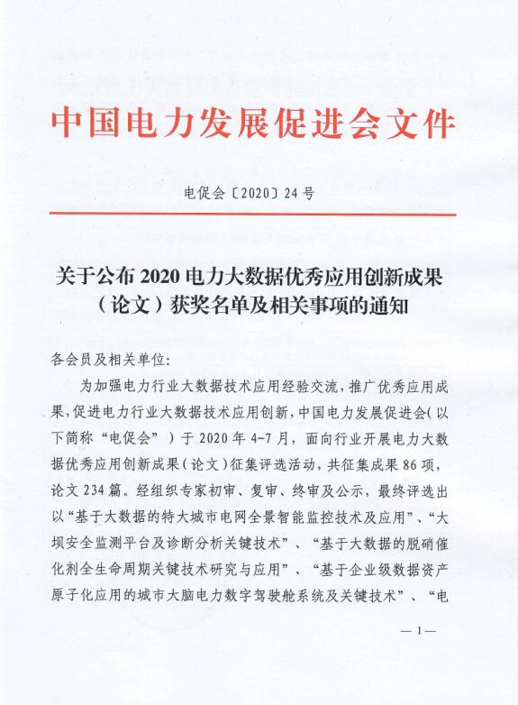 為加強電力行業(yè)大數(shù)據(jù)技術(shù)應(yīng)用經(jīng)驗交流,推廣優(yōu)秀應(yīng)用成果,促進電力行業(yè)大數(shù)據(jù)技術(shù)應(yīng)用創(chuàng)新,中國電力發(fā)展促進會(以下簡稱“電促會”)于2020年4-7月,面向行業(yè)開展電力大數(shù)據(jù)優(yōu)秀應(yīng)用創(chuàng)新成果(論文)征集評選活動,共征集成果86項,論文234篇。經(jīng)組織專家初審、復(fù)審及終審和公示,最終評選出以“基于大數(shù)據(jù)的特大城市電網(wǎng)全景智能監(jiān)控技術(shù)及應(yīng)用”、“大壩安全監(jiān)測平臺及診斷分析關(guān)鍵技術(shù)”、“基于大數(shù)據(jù)的脫硝催化劑全生命周期關(guān)鍵技術(shù)研究與應(yīng)用”、“基于企業(yè)級數(shù)據(jù)資產(chǎn)原子化應(yīng)用的城市大腦電力數(shù)字駕駛艙系統(tǒng)及關(guān)鍵技術(shù)”、“電能質(zhì)量大數(shù)據(jù)分析關(guān)鍵技術(shù)研究及應(yīng)用”為代表的優(yōu)秀應(yīng)用創(chuàng)新成果39項。以“基于大數(shù)據(jù)的變壓器油中溶解氣體關(guān)鍵狀態(tài)量動態(tài)預(yù)警研究”、“基于大數(shù)據(jù)技術(shù)的小水電機組負荷分配優(yōu)化平臺研究及應(yīng)用”為代表的優(yōu)秀論文74篇。現(xiàn)將有關(guān)事項通知如下:
