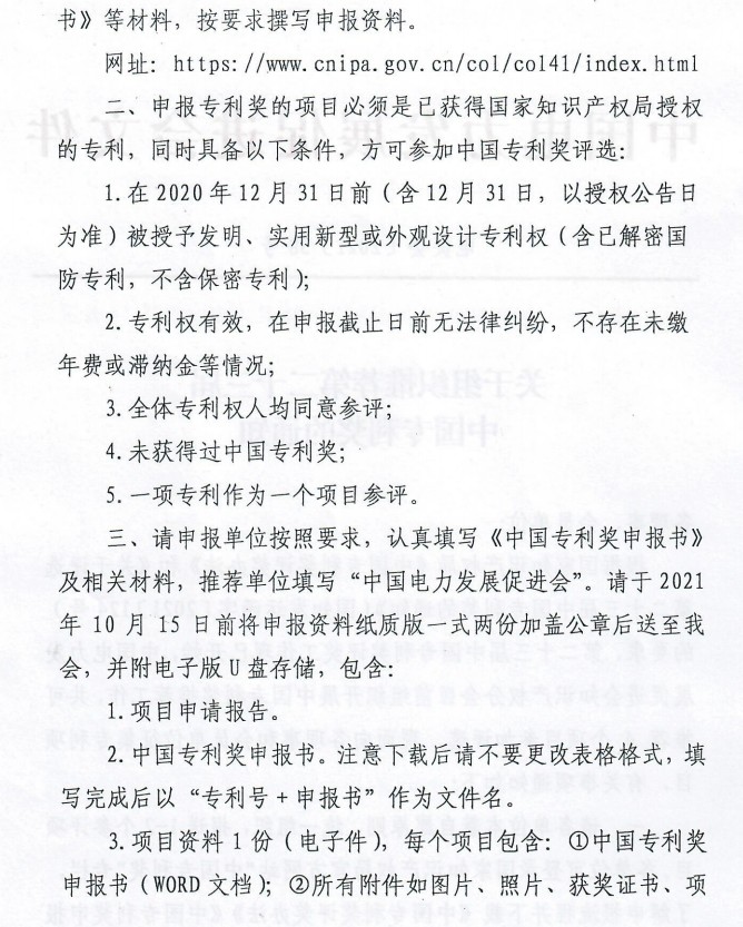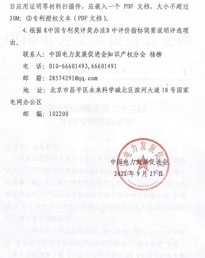 三、請申報單位按照要求,認(rèn)真填寫《中國專利獎申報書》及相關(guān)材料,推薦單位填寫“中國電力發(fā)展促進會”。請于2021年10月15日前將申報資料紙質(zhì)版一式兩份加蓋公章后送至我會,并附電子版U盤存儲,包含: