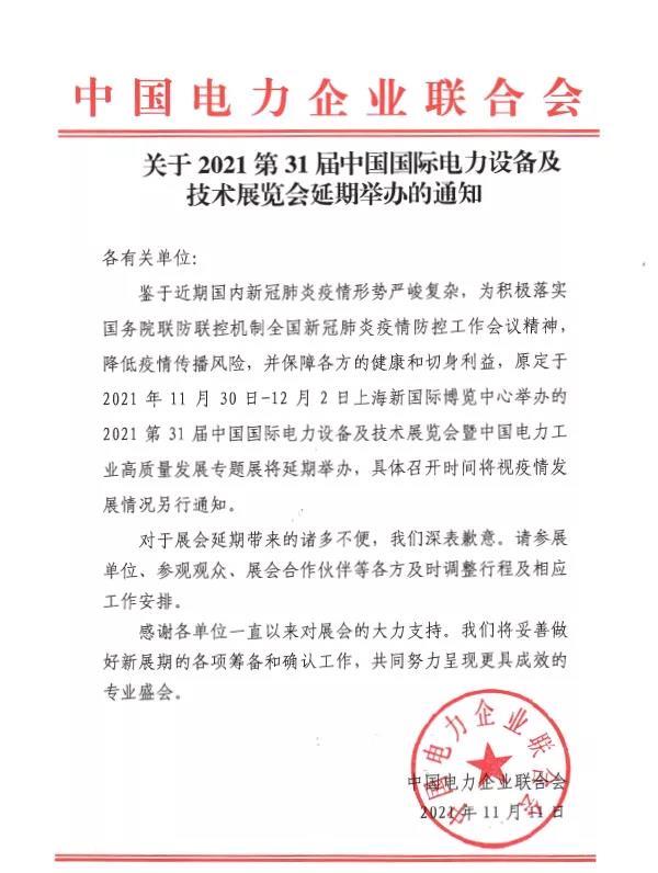 鑒于近期疫情防控形勢趨于嚴峻,為了貫徹落實國務(wù)院聯(lián)防聯(lián)控機制防疫要求,以所有參展商與觀眾的健康安全為首要考慮,同時保障展會效果,原定于 2021年11月30日至12月2日在上海新國際博覽中心舉辦的「第三十一屆上海國際電力設(shè)備及技術(shù)展覽會」暨「第二十三屆上海國際電工裝備展覽會」延期舉辦。具體延期方案將根據(jù)政府疫情防控規(guī)定另行通知。