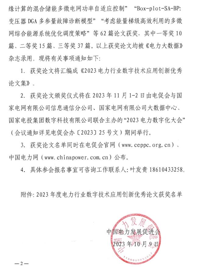 關(guān)于公布2023年度電力行業(yè)數(shù)字技術(shù)應(yīng)用創(chuàng)新優(yōu)秀論文獲獎(jiǎng)名單及相關(guān)事項(xiàng)的通知