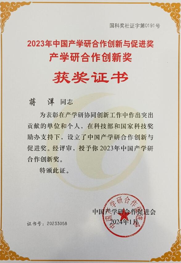 中國(guó)產(chǎn)學(xué)研合作創(chuàng)新與促進(jìn)獎(jiǎng)經(jīng)科技部和國(guó)家科技獎(jiǎng)勵(lì)辦批準(zhǔn),由中國(guó)產(chǎn)學(xué)研合作促進(jìn)會(huì)設(shè)立,每年評(píng)選一次,旨在表彰產(chǎn)學(xué)研創(chuàng)新合作工作中做出突出貢獻(xiàn)的先進(jìn)單位和個(gè)人,是我國(guó)產(chǎn)學(xué)研界協(xié)同創(chuàng)新的最高榮譽(yù)獎(jiǎng)。2023年,蔣洋大力踐行中國(guó)能建《若干意見》及“1466”戰(zhàn)略,引領(lǐng)綠色建材公司開辟了能源新材料和基建新材料兩個(gè)全新的業(yè)務(wù)板塊。與北京錦石光宇新能源有限公司聯(lián)合研發(fā)的新一代BIPV組件,一經(jīng)推出就收獲了國(guó)內(nèi)外大批合作意向,獲得中國(guó)BIPV十大品牌獎(jiǎng),與日本東京大學(xué)、土與蔬菜株式會(huì)社聯(lián)合研發(fā)的“基于工農(nóng)業(yè)固廢再生土壤的創(chuàng)新技術(shù)”,獲2023(第四屆)國(guó)際碳中和與綠色投資大會(huì)“零碳中國(guó)”十大創(chuàng)新技術(shù)。
