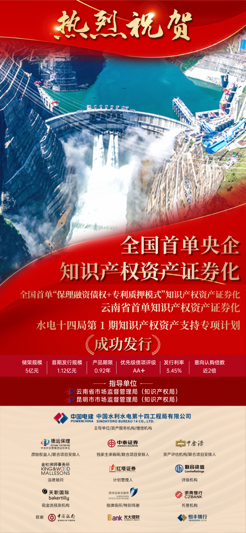 2023年12月29日,在歷經(jīng)一年多的政策解讀、行業(yè)調(diào)研、市場(chǎng)挖掘、方案設(shè)計(jì)、可行性論證、項(xiàng)目推動(dòng)、申報(bào)、發(fā)行等一系列工作后,公司所屬水電十四局主導(dǎo)的“水電十四局第1期知識(shí)產(chǎn)權(quán)資產(chǎn)支持專項(xiàng)計(jì)劃”在深圳證券交易所成功發(fā)行并設(shè)立。標(biāo)志著全國(guó)央企首單、全國(guó)“保理融資債權(quán)+專利質(zhì)押模式”首單知識(shí)產(chǎn)權(quán)資產(chǎn)證券化成功落地。中國(guó)電建成為第一家成功發(fā)行知識(shí)產(chǎn)權(quán)證券的央企單位。