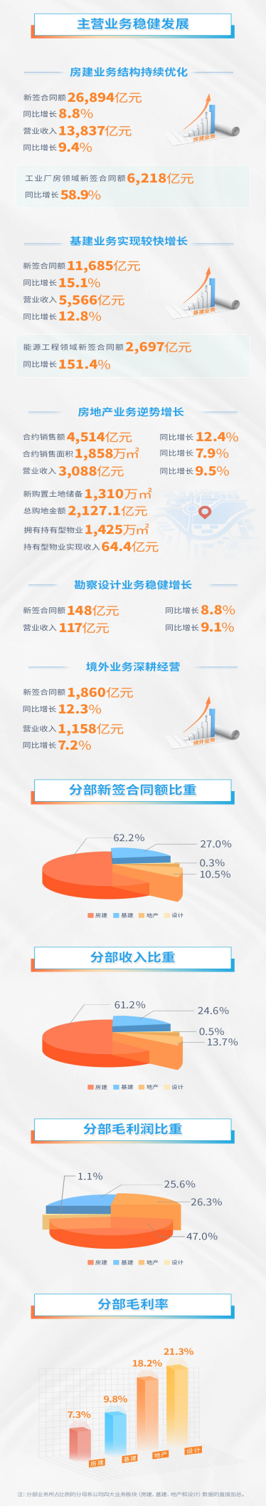 房建業(yè)務(wù)結(jié)構(gòu)持續(xù)優(yōu)化,新簽合同額2.69萬(wàn)億元、同比增長(zhǎng)8.8%;工業(yè)廠房、科教文衛(wèi)體設(shè)施、商業(yè)綜合等公共建筑領(lǐng)域新簽合同額占比持續(xù)提升;基建業(yè)務(wù)發(fā)力重點(diǎn)領(lǐng)域,新簽合同額11,685億元,同比增長(zhǎng)15.1%;市政工程、交通運(yùn)輸工程等領(lǐng)域取得一批重大工程;能源工程、水務(wù)及環(huán)保、水利水運(yùn)等領(lǐng)域取得新突破,新簽合同額合計(jì)占比提升至37.3%;地產(chǎn)業(yè)務(wù)加快適應(yīng)新發(fā)展模式,中海地產(chǎn)權(quán)益銷售額位列行業(yè)第二,利潤(rùn)率保持行業(yè)領(lǐng)先,主要指標(biāo)穩(wěn)中有升。堅(jiān)持聚焦高能級(jí)城市的投資布局,全年新購(gòu)置土地43宗,新增土地儲(chǔ)備764萬(wàn)平方米,新增土地貨值位列行業(yè)第一,購(gòu)地金額人民幣1,342.1億元。全年實(shí)現(xiàn)合約銷售額2,670億元,同比增長(zhǎng)4.9%。堅(jiān)持穩(wěn)健審慎的財(cái)務(wù)策略,牢牢把握“三道紅線”調(diào)控下處于綠檔的優(yōu)勢(shì),堅(jiān)持精益建造,在聚焦加快發(fā)展住宅開(kāi)發(fā)主業(yè)的同時(shí),推動(dòng)商業(yè)物業(yè)、教育養(yǎng)老、物流等業(yè)務(wù)發(fā)展。中建地產(chǎn)積極應(yīng)對(duì)市場(chǎng)變化,豐富土地獲取路徑和方式,新購(gòu)置土地59宗,新增土地儲(chǔ)備546萬(wàn)平方米,購(gòu)地金額785億元;全年實(shí)現(xiàn)合約銷售額1,844億元,同比增長(zhǎng)25.3%??辈煸O(shè)計(jì)業(yè)務(wù)穩(wěn)健增長(zhǎng),夯實(shí)傳統(tǒng)設(shè)計(jì)主業(yè),新簽合同額148億元,營(yíng)業(yè)收入117億元。境外業(yè)務(wù)堅(jiān)持深耕運(yùn)營(yíng),全力應(yīng)對(duì)復(fù)雜多變的國(guó)際形勢(shì),持續(xù)增強(qiáng)全球資源配置能力。新簽合同額1,860億元,同比增加12.3%,其中建筑業(yè)務(wù)新簽合同額1,755億元,同比增長(zhǎng)15.4%。公司大力實(shí)施海外高質(zhì)量發(fā)展戰(zhàn)略,積極參與共建“一帶一路”國(guó)際合作。