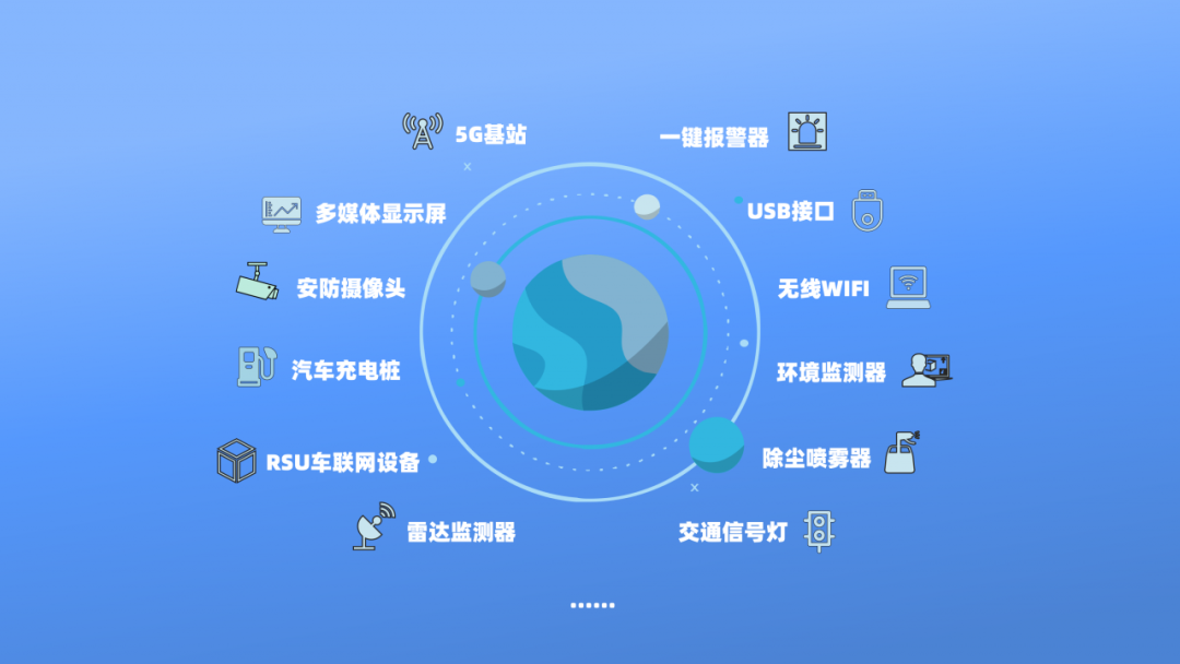 在不同高位層次里規(guī)劃部署相應(yīng)的智能化設(shè)備,包括但不限于5G基站、多媒體顯示屏、安防攝像頭、交通信號燈、充電樁、一鍵呼叫等數(shù)十類設(shè)備。每一層次里的設(shè)備都可靈活更換、拆卸;桿體內(nèi)匹配相應(yīng)的電容器和智能斷路器,在配電側(cè)整合強弱電機柜,安裝智能門鎖、溫度監(jiān)測,實行低壓供電,分級控制,充分滿足個性化的場景應(yīng)用需求。