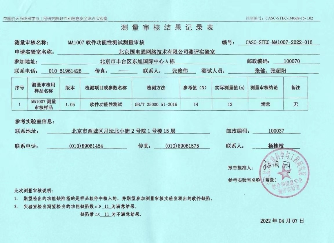 CNAS是由國家認(rèn)證認(rèn)可監(jiān)督管理委員會批準(zhǔn)設(shè)立并授權(quán)的國家認(rèn)可機(jī)構(gòu),統(tǒng)一負(fù)責(zé)對認(rèn)證機(jī)構(gòu)、實驗室和檢驗機(jī)構(gòu)等相關(guān)機(jī)構(gòu)的認(rèn)可工作。獲得測評實驗室認(rèn)可(CNAS)資質(zhì),則表明具備了可自主開展出廠測試工作的能力。3月22日至4月2日,信產(chǎn)國電通測評實驗室報名參與中國航天科技集團(tuán)有限公司軟件評測中心組織開展的軟件功能性測量審核。在測量審核過程中,信產(chǎn)國電通檢測人員精心組織,嚴(yán)格按照作業(yè)指導(dǎo)書及軟件功能性測試技術(shù)標(biāo)準(zhǔn)規(guī)范的要求,認(rèn)真開展檢測工作,成功在規(guī)定時間內(nèi)反饋出檢測結(jié)果報告單和原始記錄。經(jīng)中國航天科技集團(tuán)有限公司軟件評測中心認(rèn)定,本次測量審核結(jié)果為“滿意”。