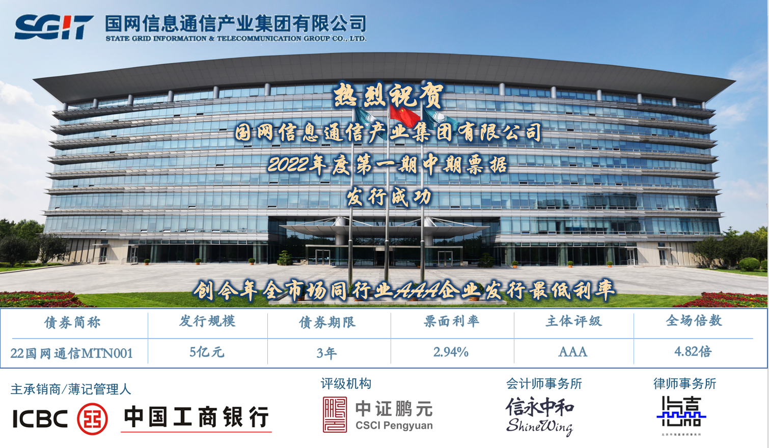2022年5月20日,國(guó)網(wǎng)信息通信產(chǎn)業(yè)集團(tuán)有限公司(以下簡(jiǎn)稱“集團(tuán)”)首次公開成功發(fā)行2022年度第一期中期票據(jù)(債券簡(jiǎn)稱“22國(guó)網(wǎng)信通MTN001”),發(fā)行規(guī)模5億元,期限3年,票面利率2.94%,全場(chǎng)認(rèn)購倍數(shù)4.82倍。該利率較3年期同期貸款利率下降約1.3個(gè)百分點(diǎn),為今年全市場(chǎng)同行業(yè)AAA企業(yè)發(fā)行最低利率。