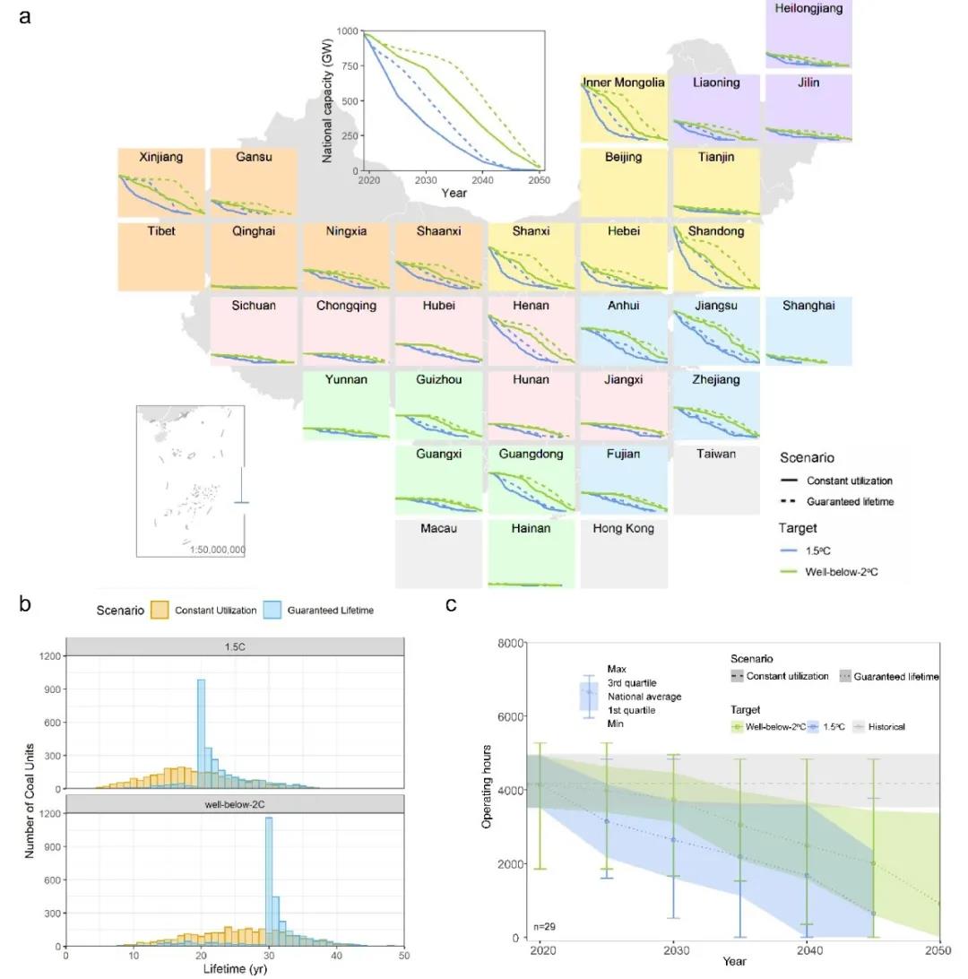 圖2煤電機(jī)組退出路徑以及兩種退役情景下對煤電機(jī)組運(yùn)行年限和利用小時(shí)的影響。在1.5°C和2°C目標(biāo)和兩種電廠退役情景下(a)國家級(jí)及省級(jí)煤電機(jī)組退出路徑圖;(b)煤電機(jī)組運(yùn)行年限直方圖分布;(c)煤電機(jī)組利用小時(shí)數(shù)變化曲線